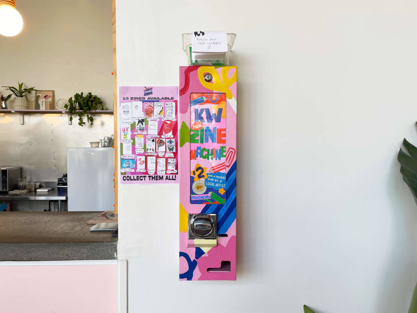 Mini vending machine dispensing mystery zines from local artists. In collaboration with KW Zinetopia, installed at Whoopsie Daisy Drinks in Kitchener, Ontario.